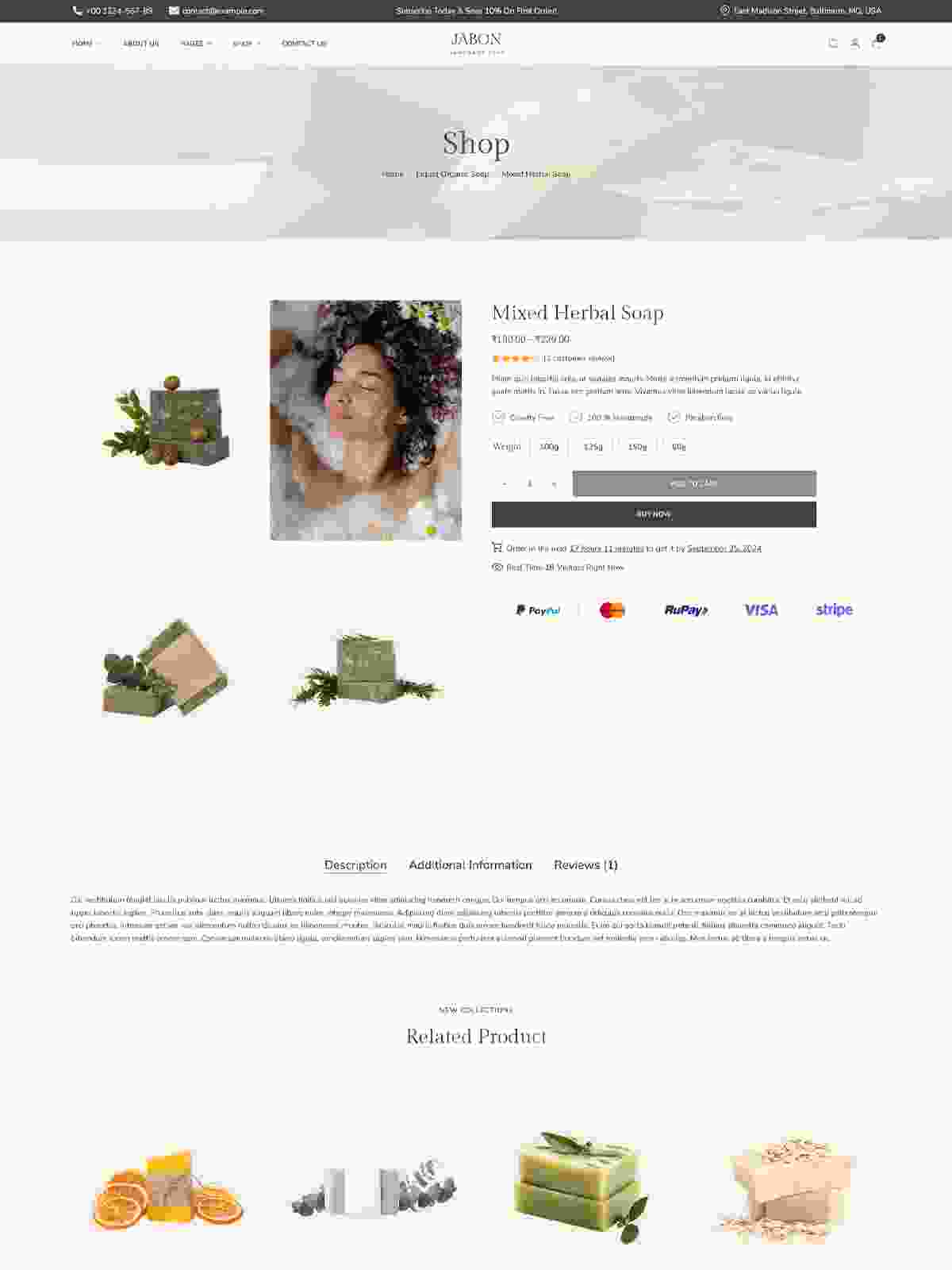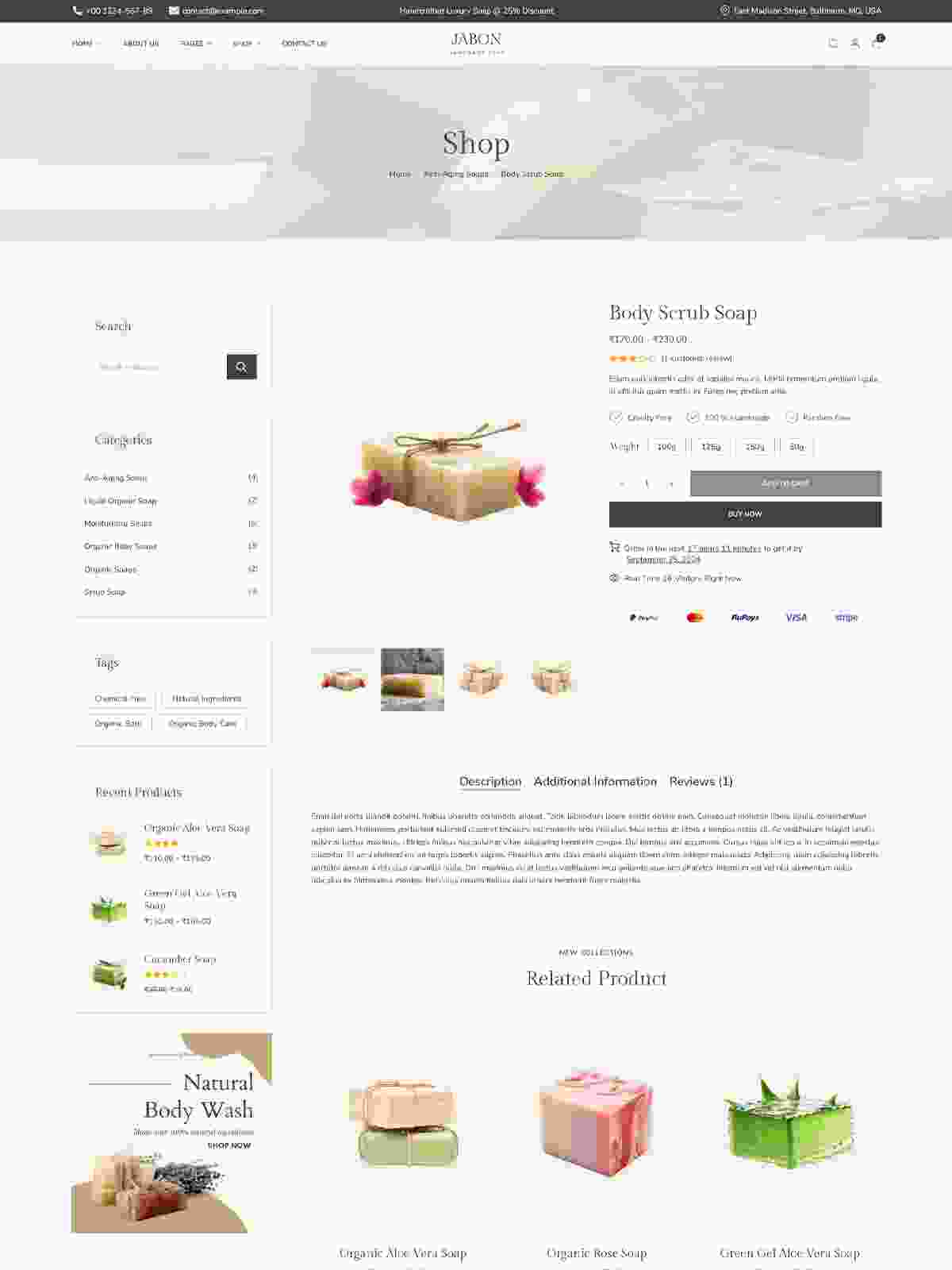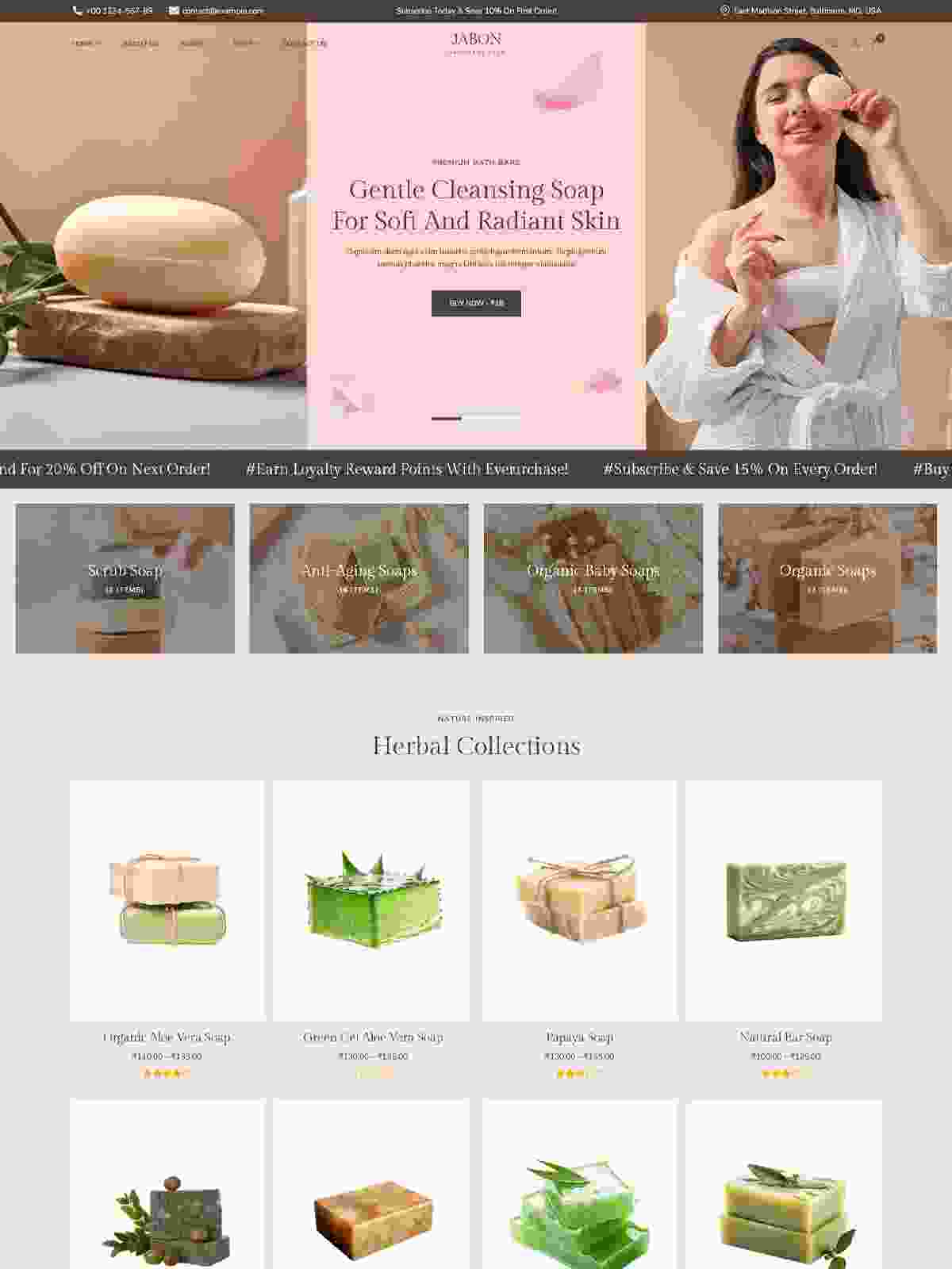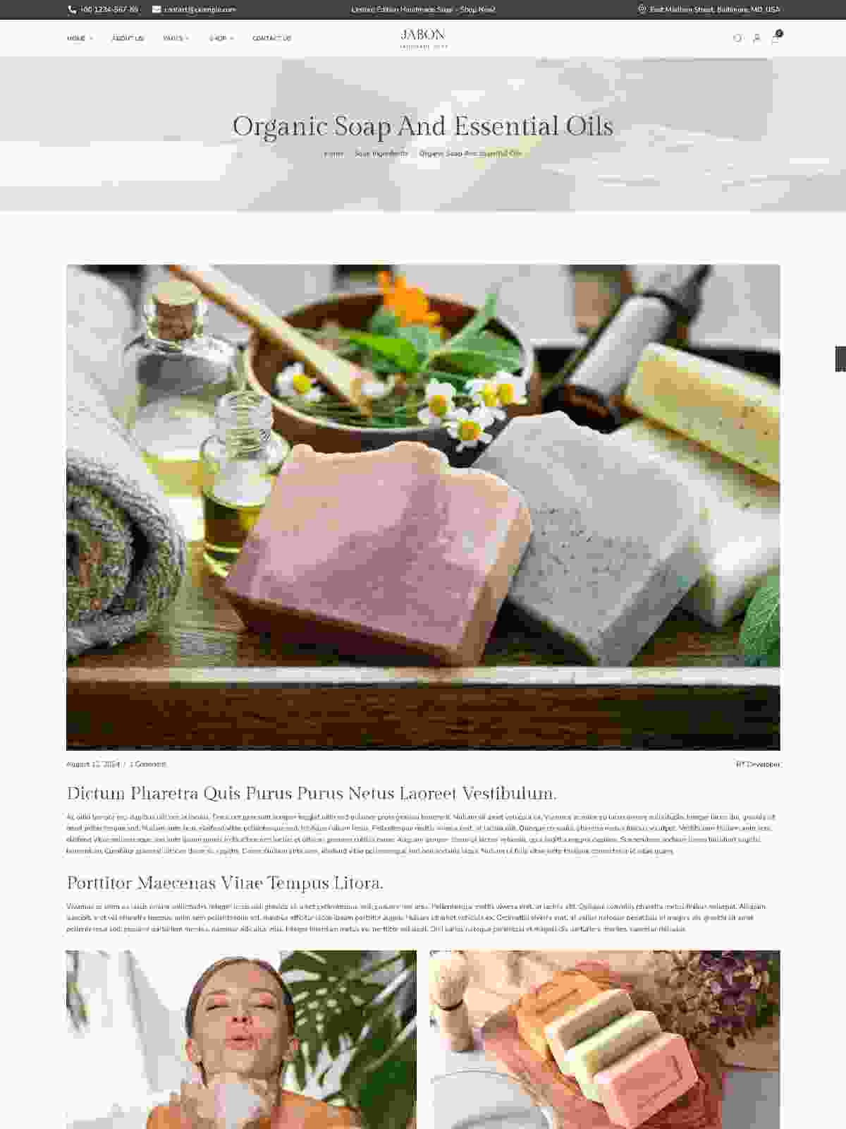 Jabon – Handmade Soap WordPress Theme, Best Designs for Handmade Soap and Cosmetics Beauty Store Websites. It Is Suitable for Natural Soap Products and Homemade Soap Manufacturing Business Ecommerce, Natural Health Care Stores, Beauty Product, Natural Medicine Clinic, Organic and Natural Products eCom Companies, Organic Shops, Organic Life Style Tools, Multipurpose Cosmetic Shop websites.